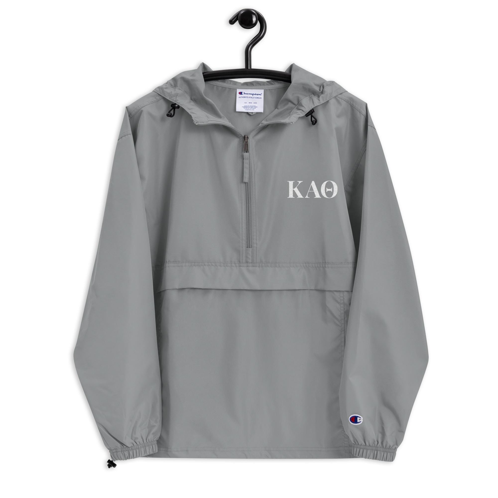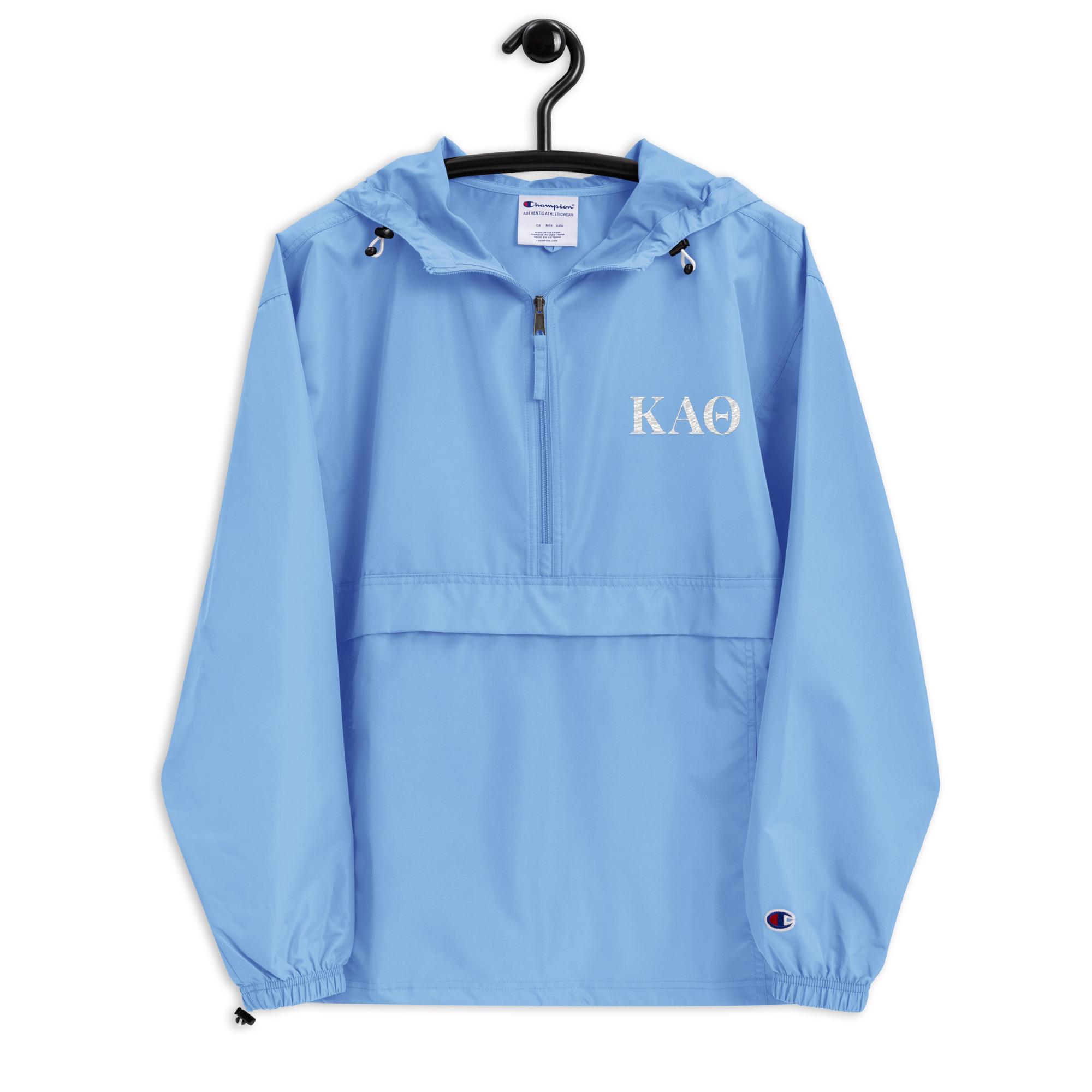Protect yourself from the elements with this Custom Designed Kappa Alpha Theta Embroidered Champion packable jacket. This wind and rain resistant polyester jacket with a detailed embroidery design has a practical hood, front kangaroo pocket, and zipped pouch pocket which you can pull out and use to scrunch the jacket into for convenient storage. Leopalooza Designs are fully licensed through Affinity Licensing LLC.