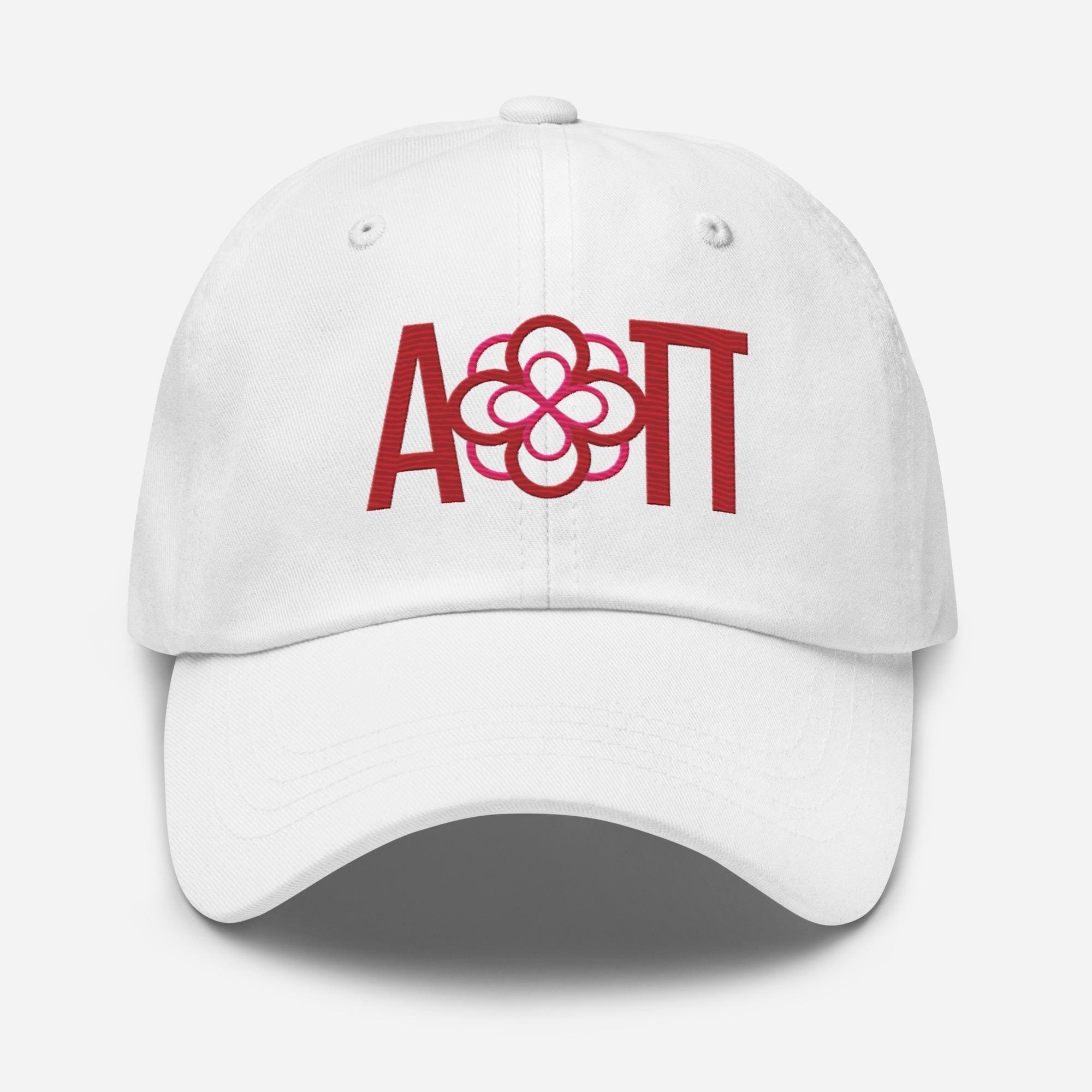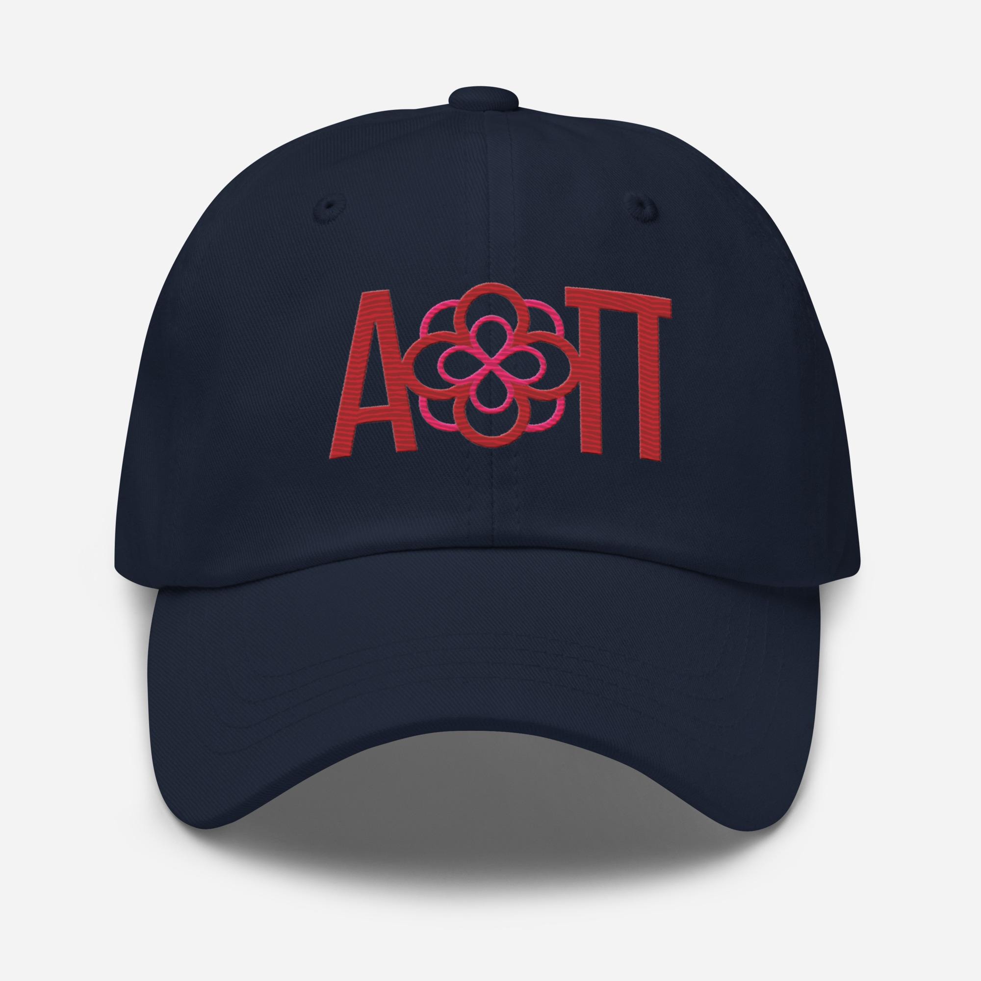 Custom designed Alpha Omicron Pi Embroidered Hat. Brought to you by Leopalooza Designs, this is the perfect Hat to compliment you to and from class or around campus. This one's got a low profile with an adjustable strap and curved visor. As always, Leopalooza Designs are fully licensed through Affinity Licensing LLC.