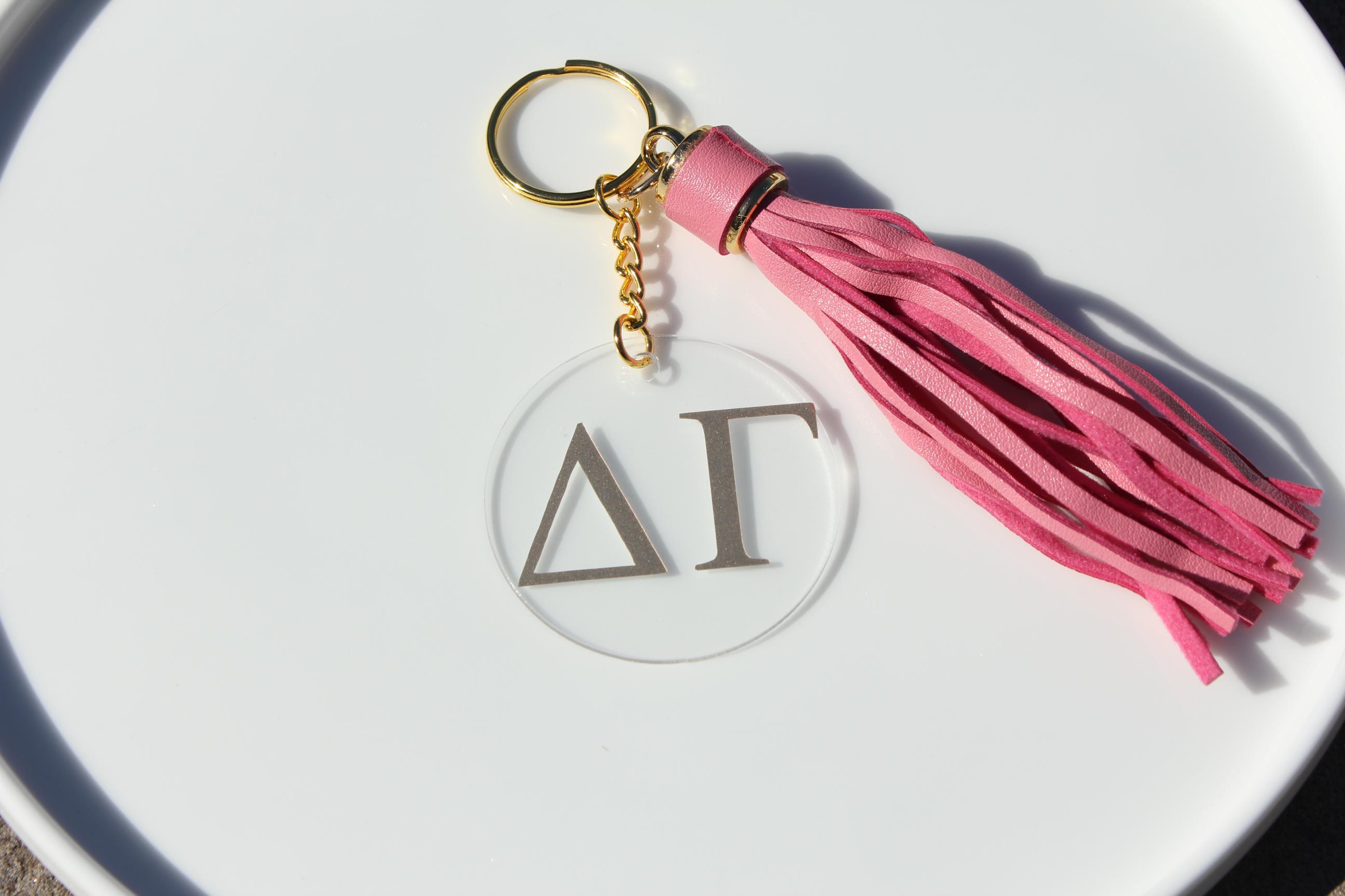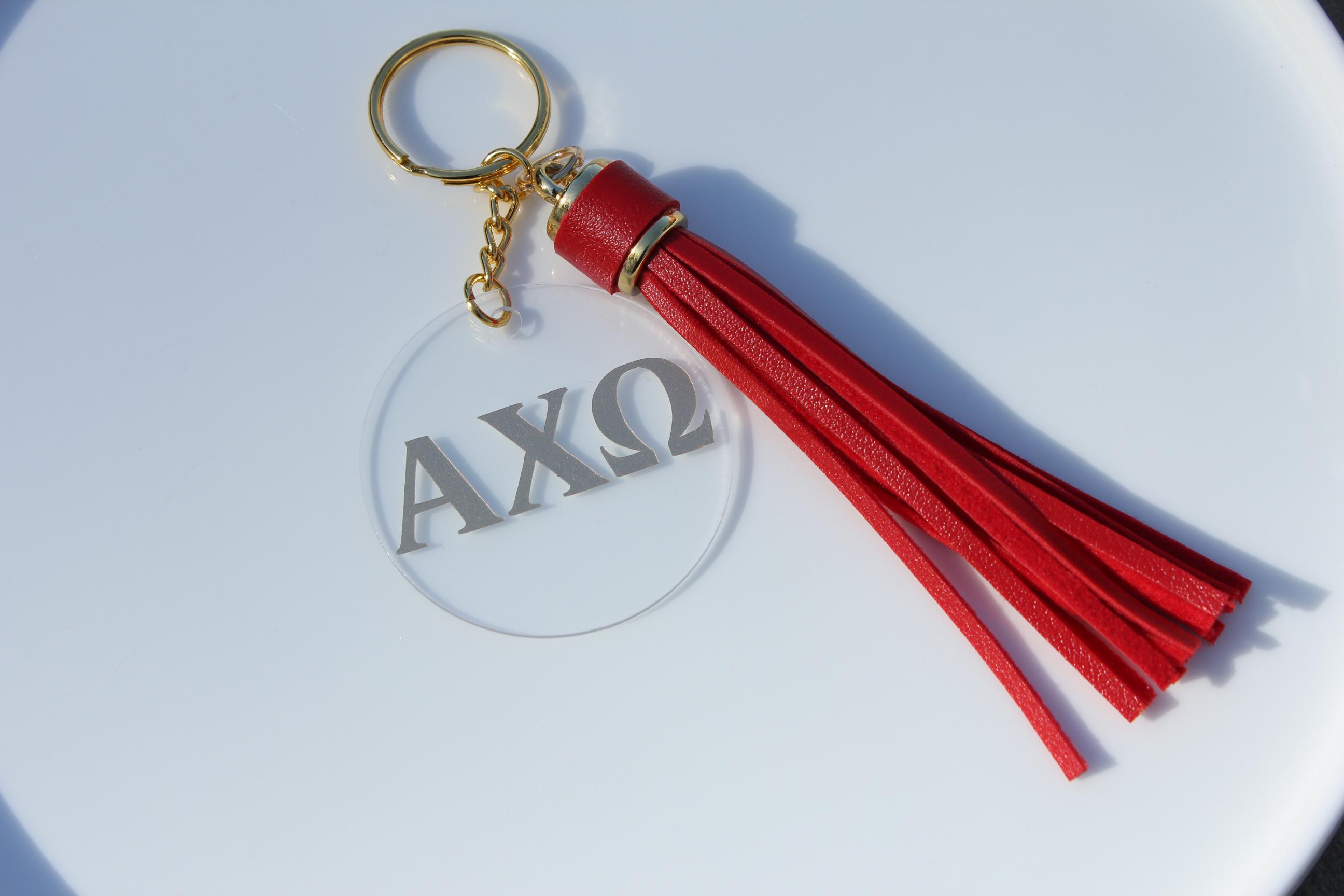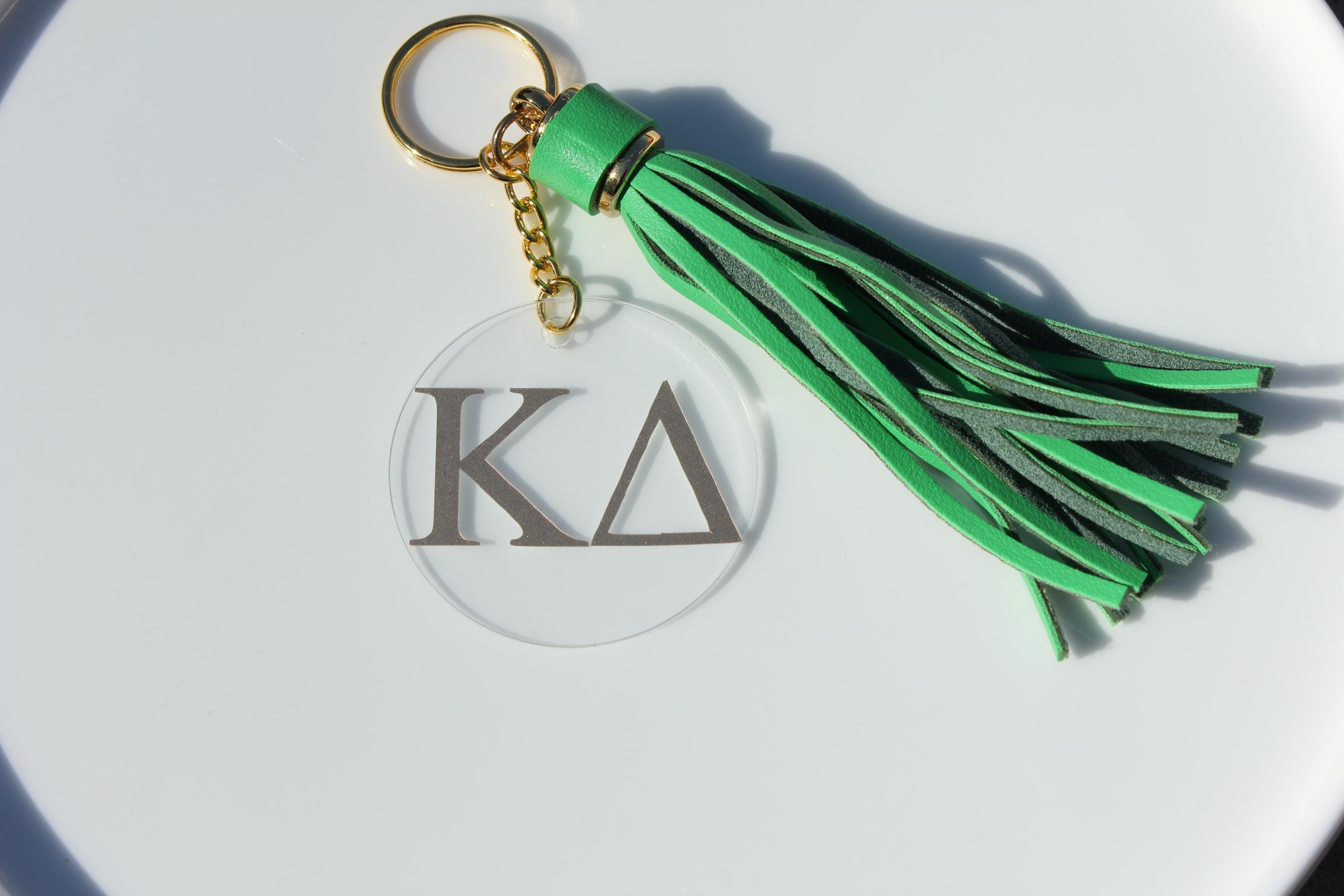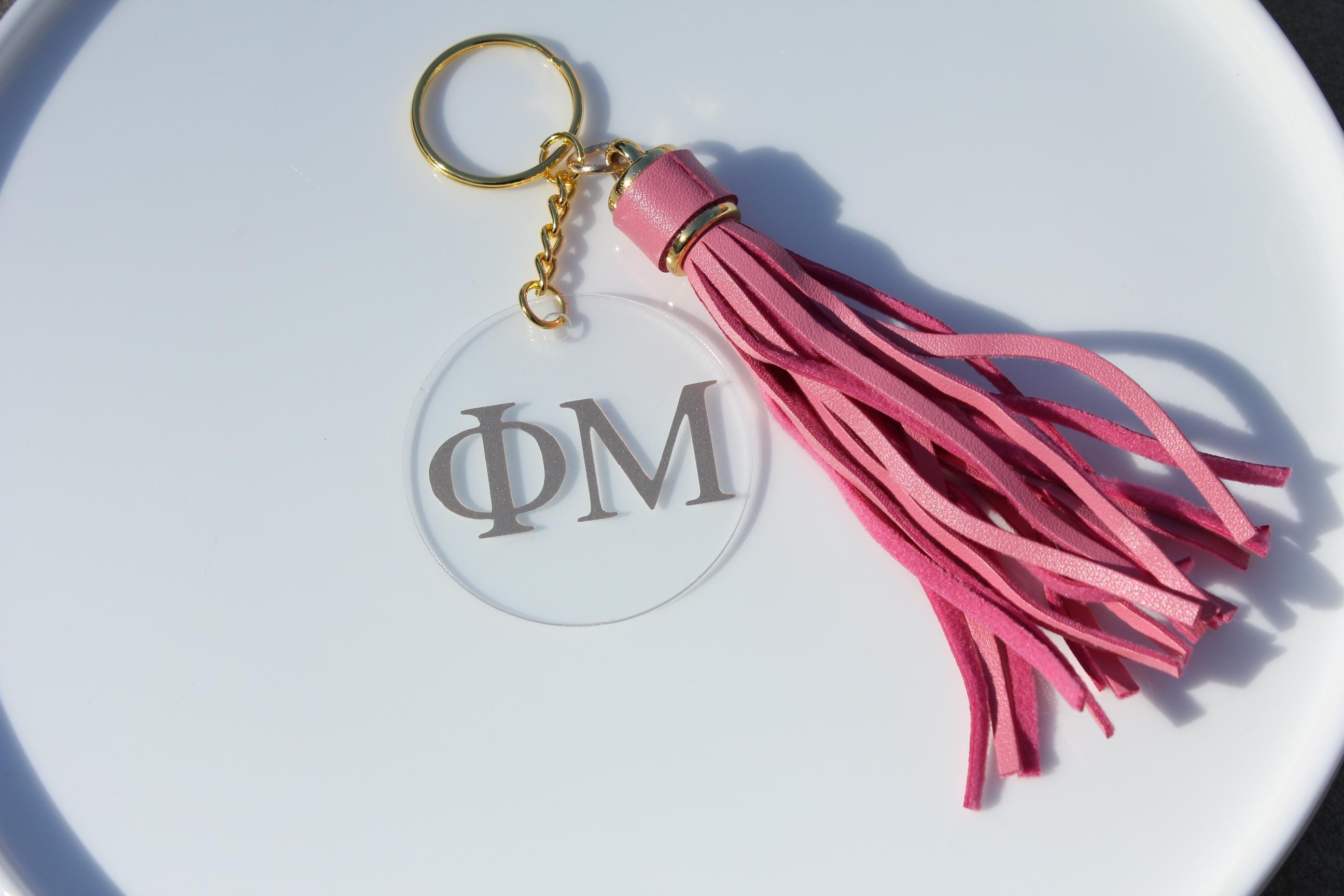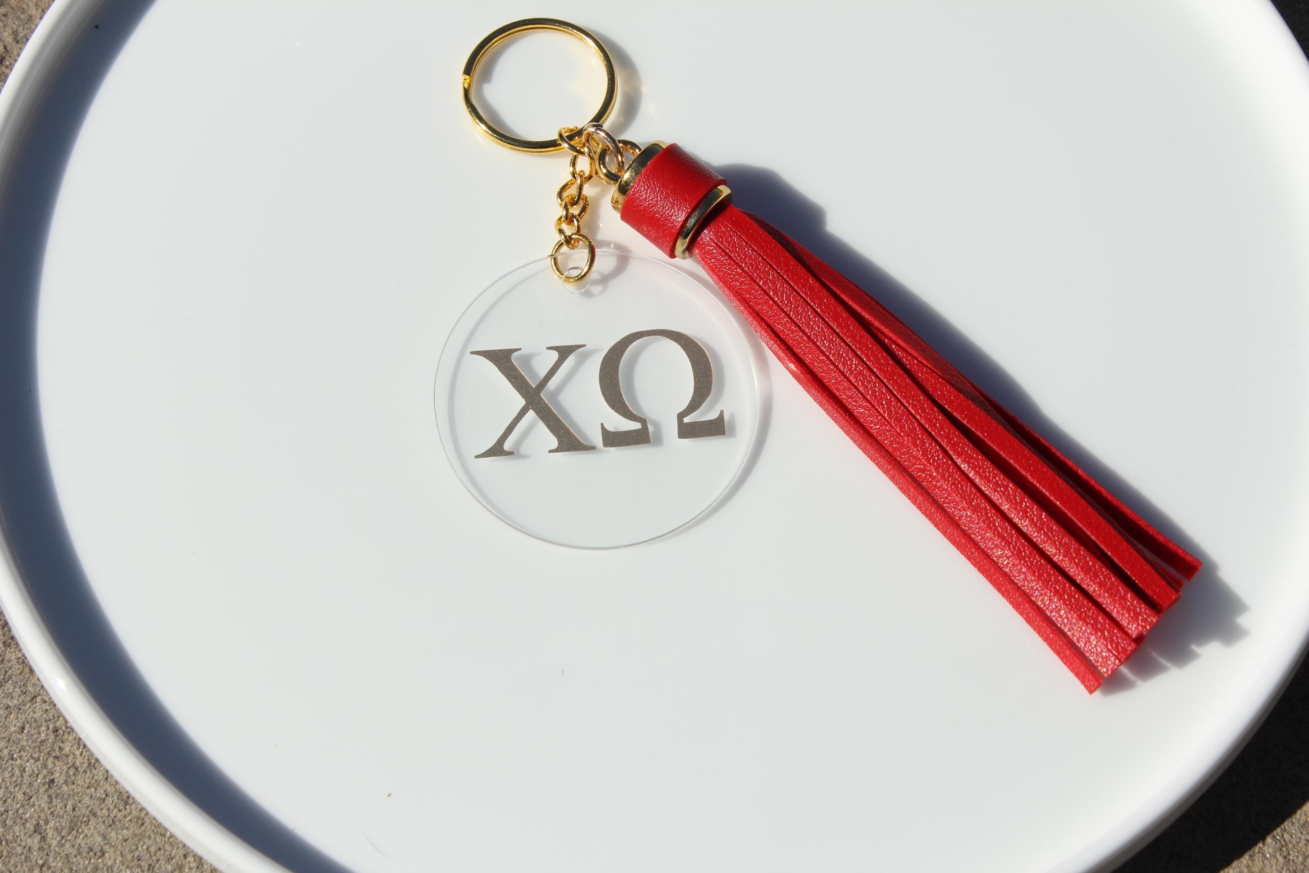 Custom made Licensed Sorority Acrylic and Leather Tassel Keychain personalized to your Sorority. Genuine leather tassel with thin acrylic disc customized with Gold Greek Lettering. Lightweight and versatile with traditional style and classic elegance. These keychains are perfect for gifting your sorority sister, new pledge or daughter on Bid Day. Color combinations are as shown in photos and specific to each Sorority. No variations available.