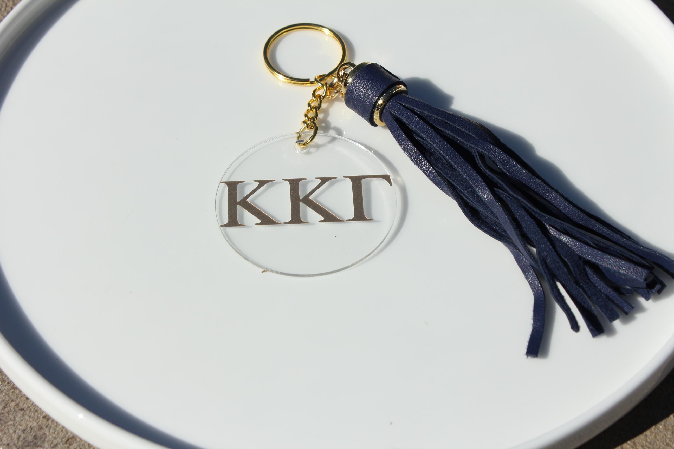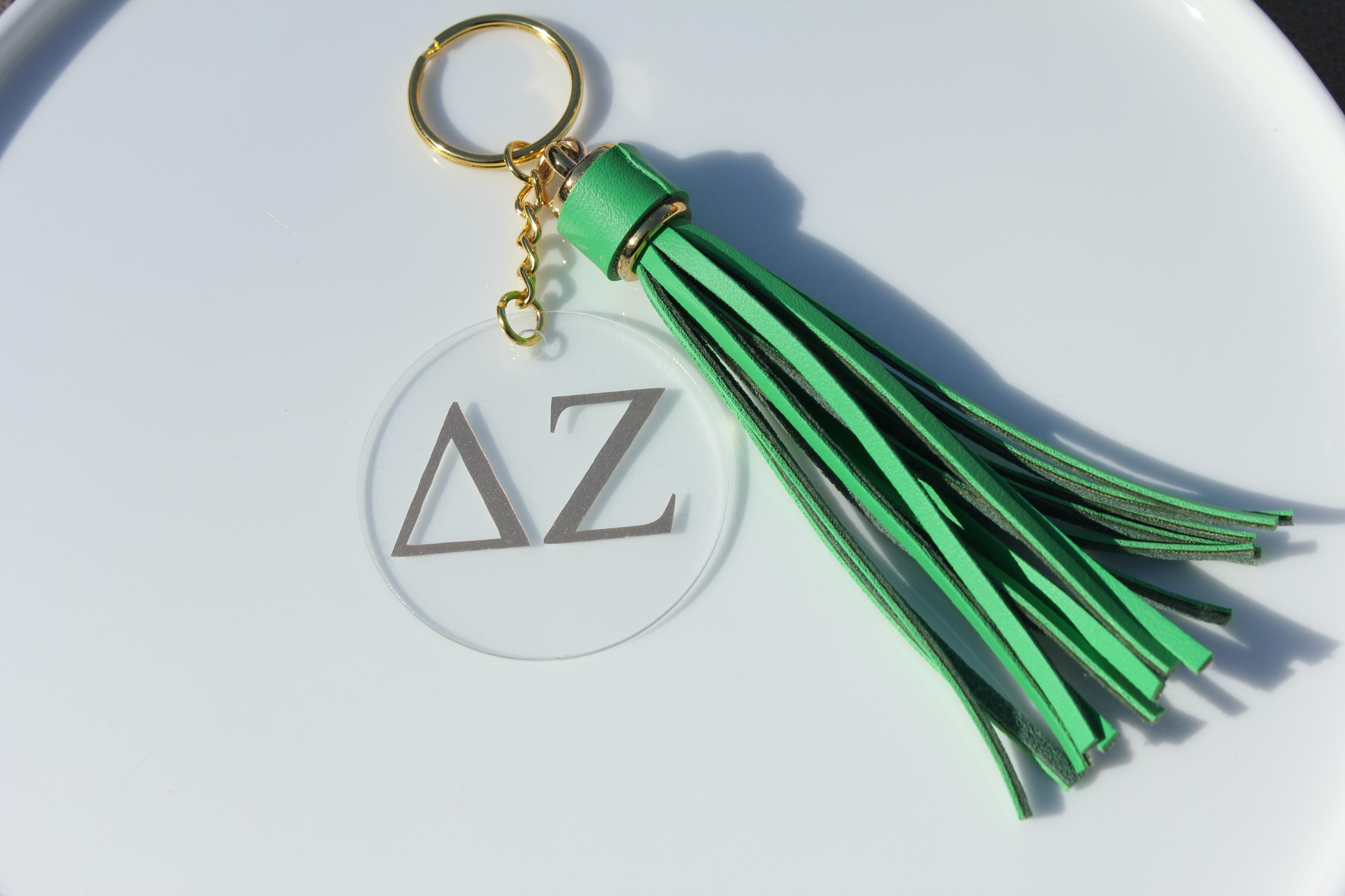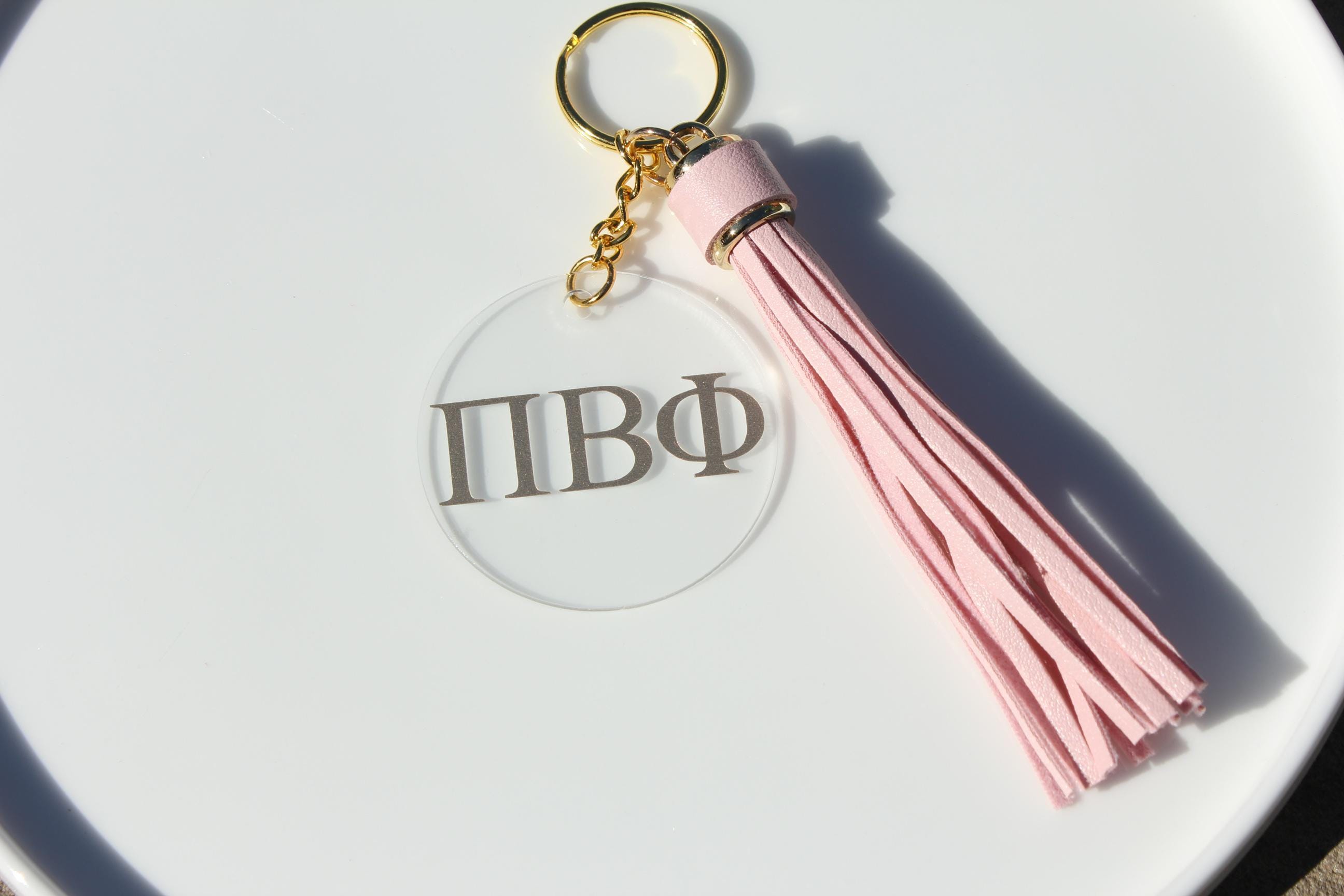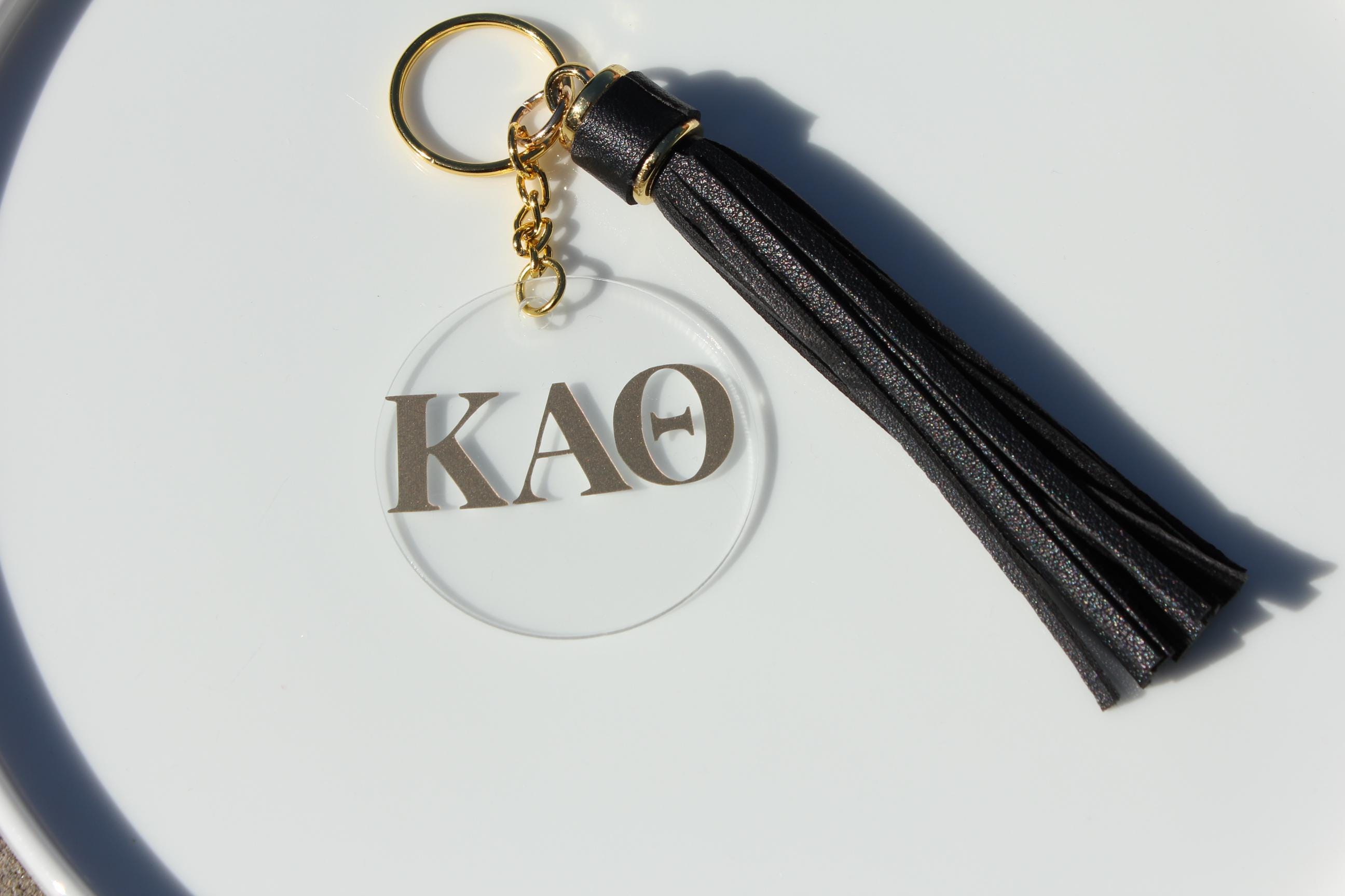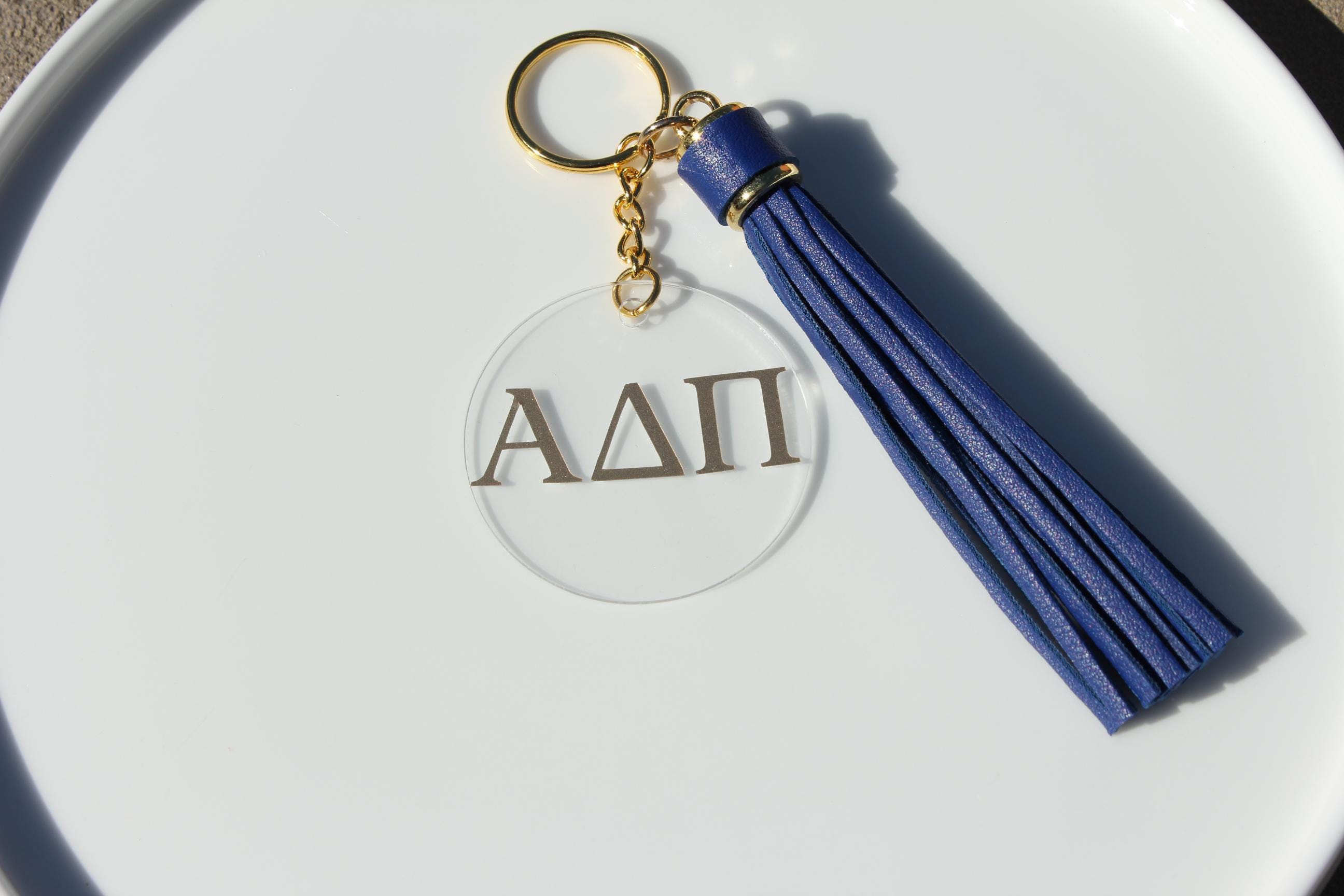 Custom made Licensed Sorority Acrylic and Leather Tassel Keychain personalized to your Sorority. Genuine leather tassel with thin acrylic disc customized with Gold Greek Lettering. Lightweight and versatile with traditional style and classic elegance. These keychains are perfect for gifting your sorority sister, new pledge or daughter on Bid Day. Color combinations are as shown in photos and specific to each Sorority. No variations available.