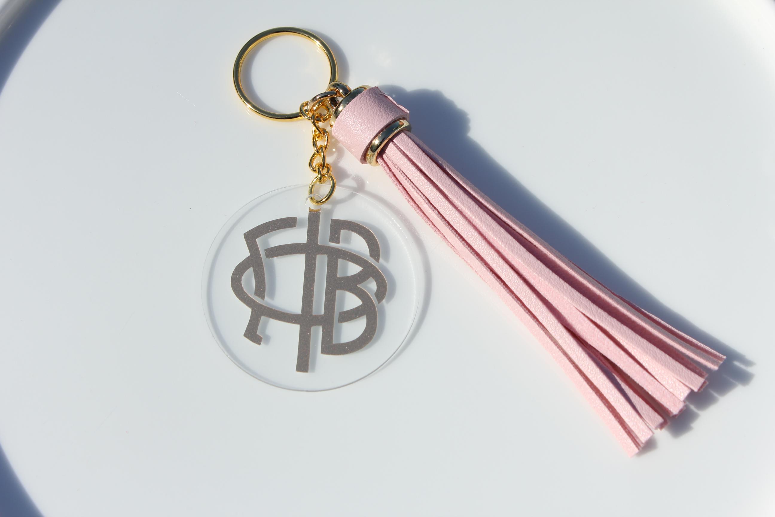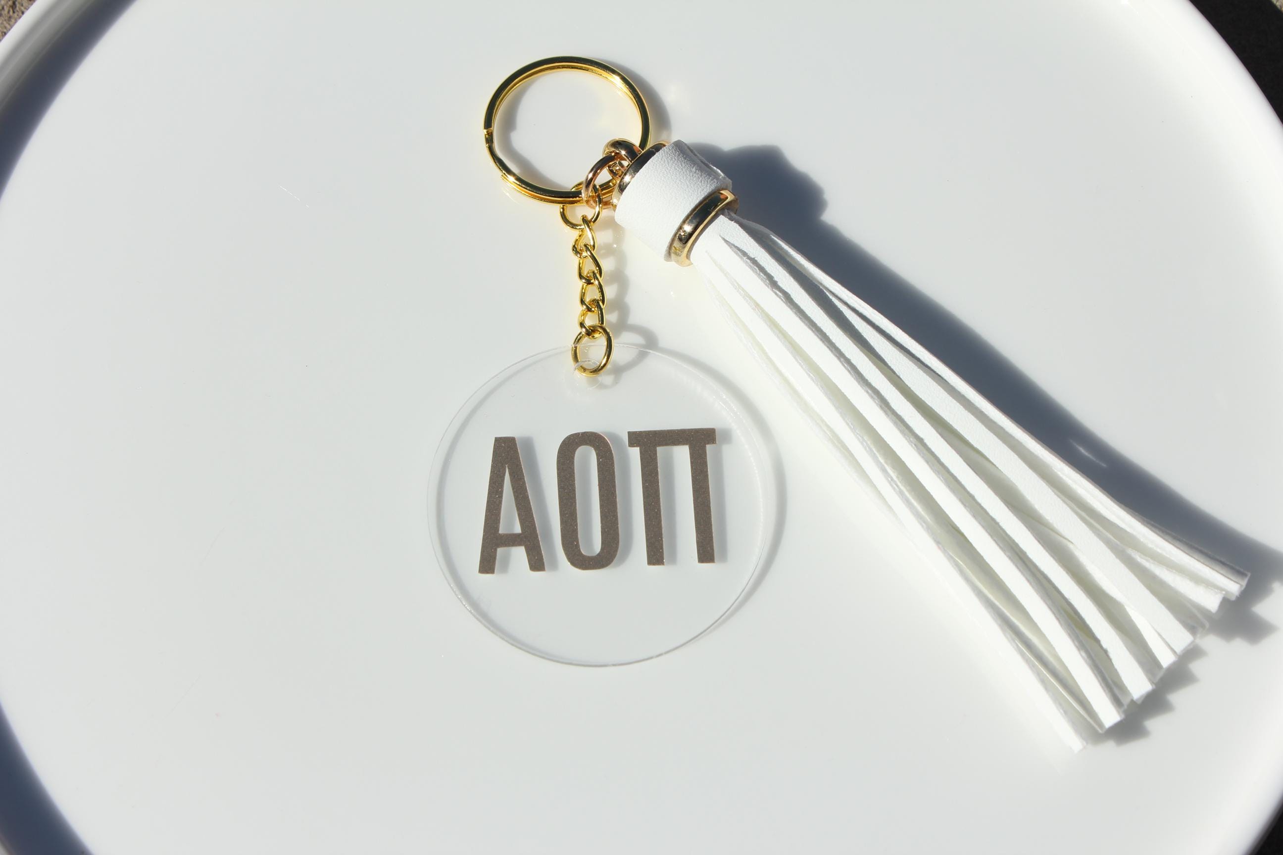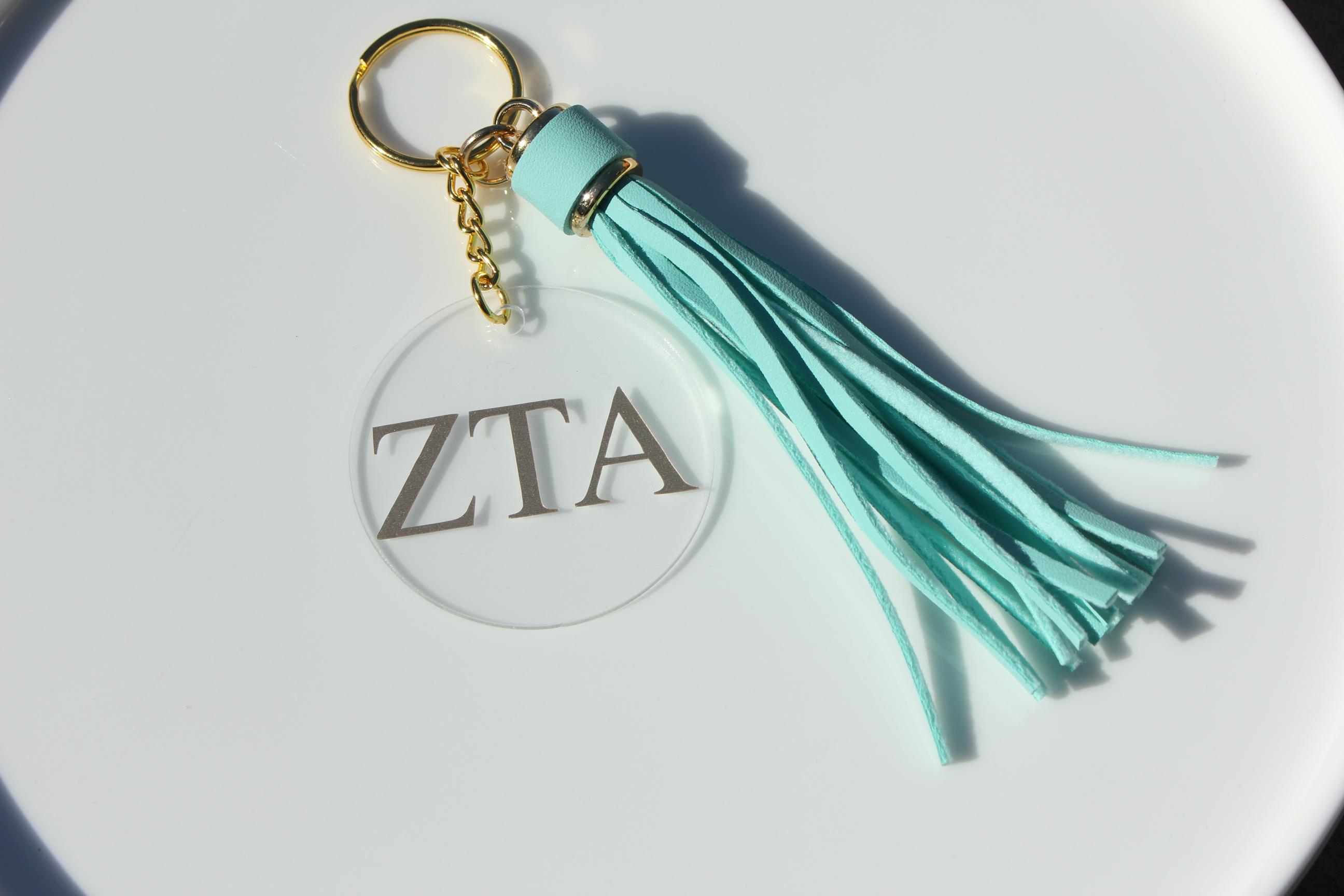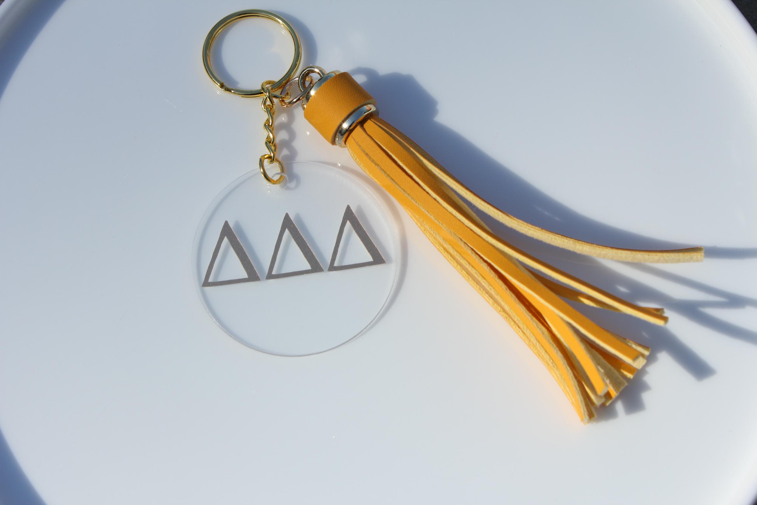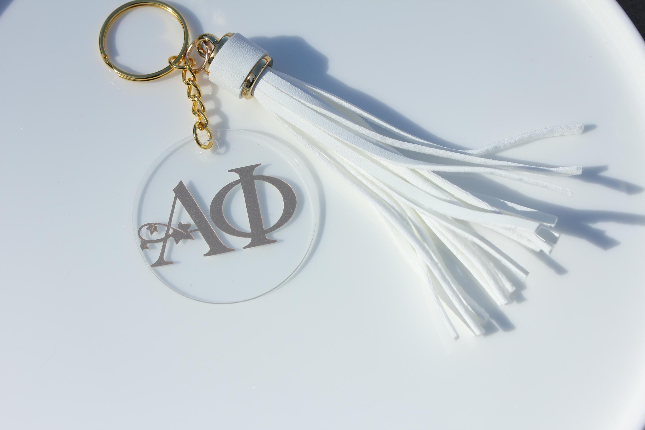 Custom made Licensed Sorority Acrylic and Leather Tassel Keychain personalized to your Sorority. Genuine leather tassel with thin acrylic disc customized with Gold Greek Lettering. Lightweight and versatile with traditional style and classic elegance. These keychains are perfect for gifting your sorority sister, new pledge or daughter on Bid Day. Color combinations are as shown in photos and specific to each Sorority. No variations available.