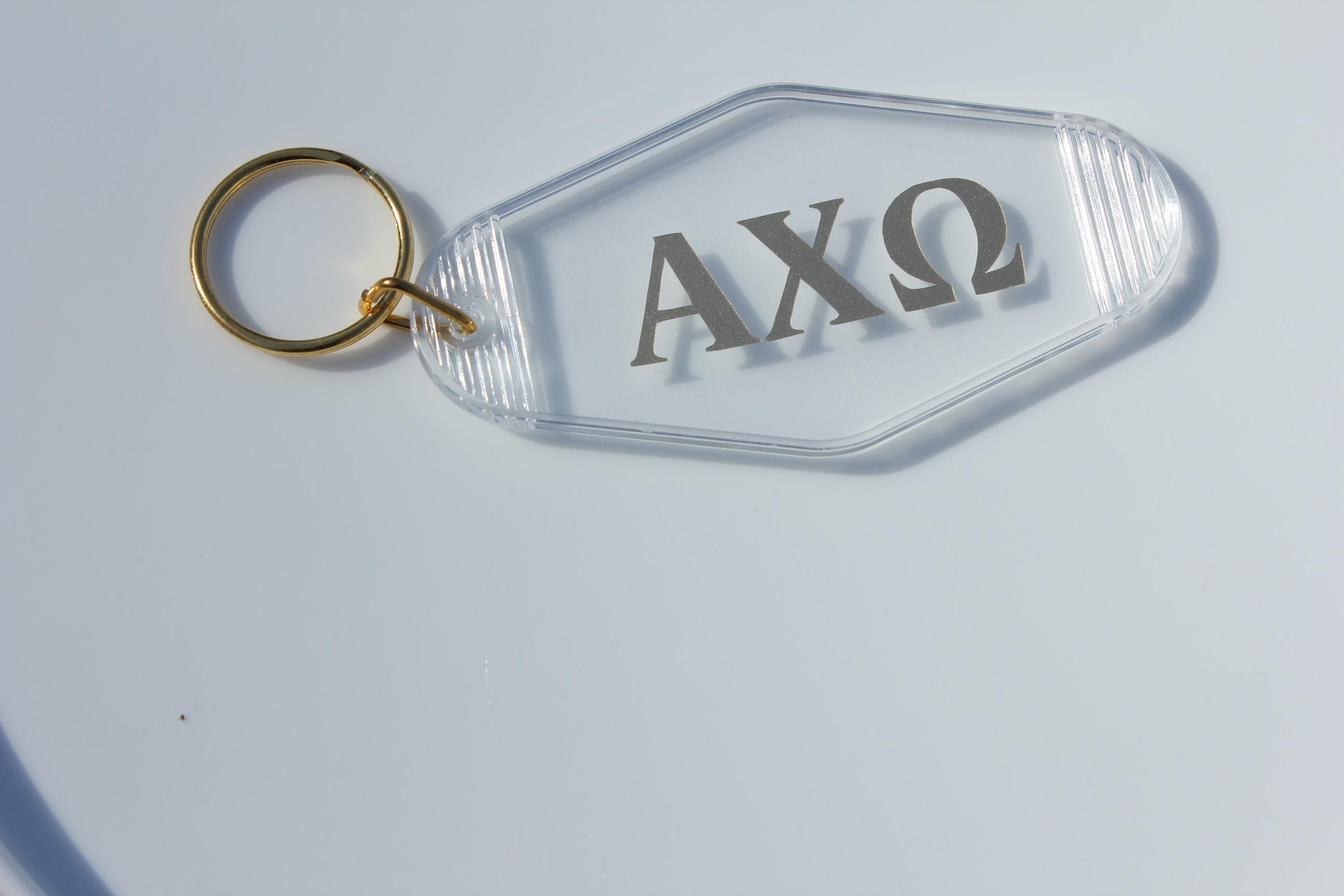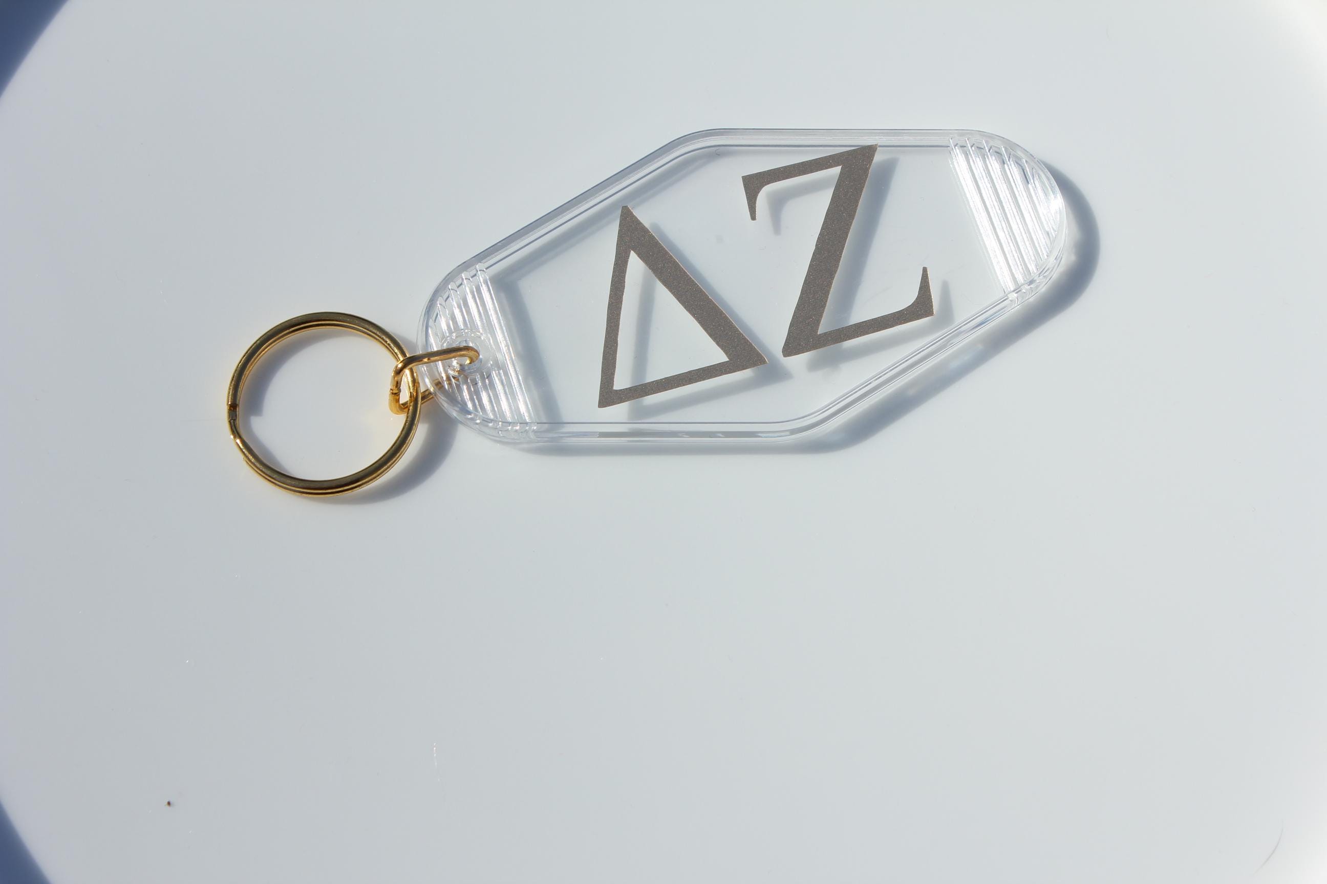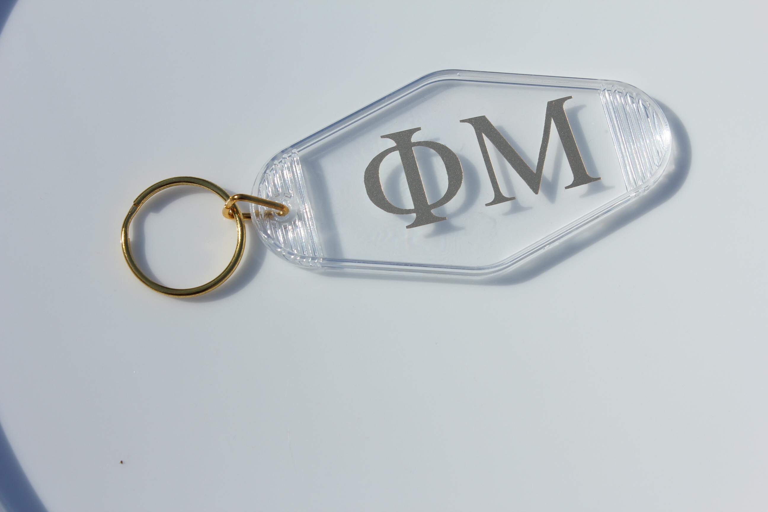 Trendy Acrylic Motel-style Keychain customized for Sorority Members and Alumni. Gold or Silver accents with gold or silver Greek Lettering and lightweight. Perfect for gifting your sisters, daughters, and new pledges on Bid Day. Show off your Chapter pride with these super cute, sturdy and affordable keychains.