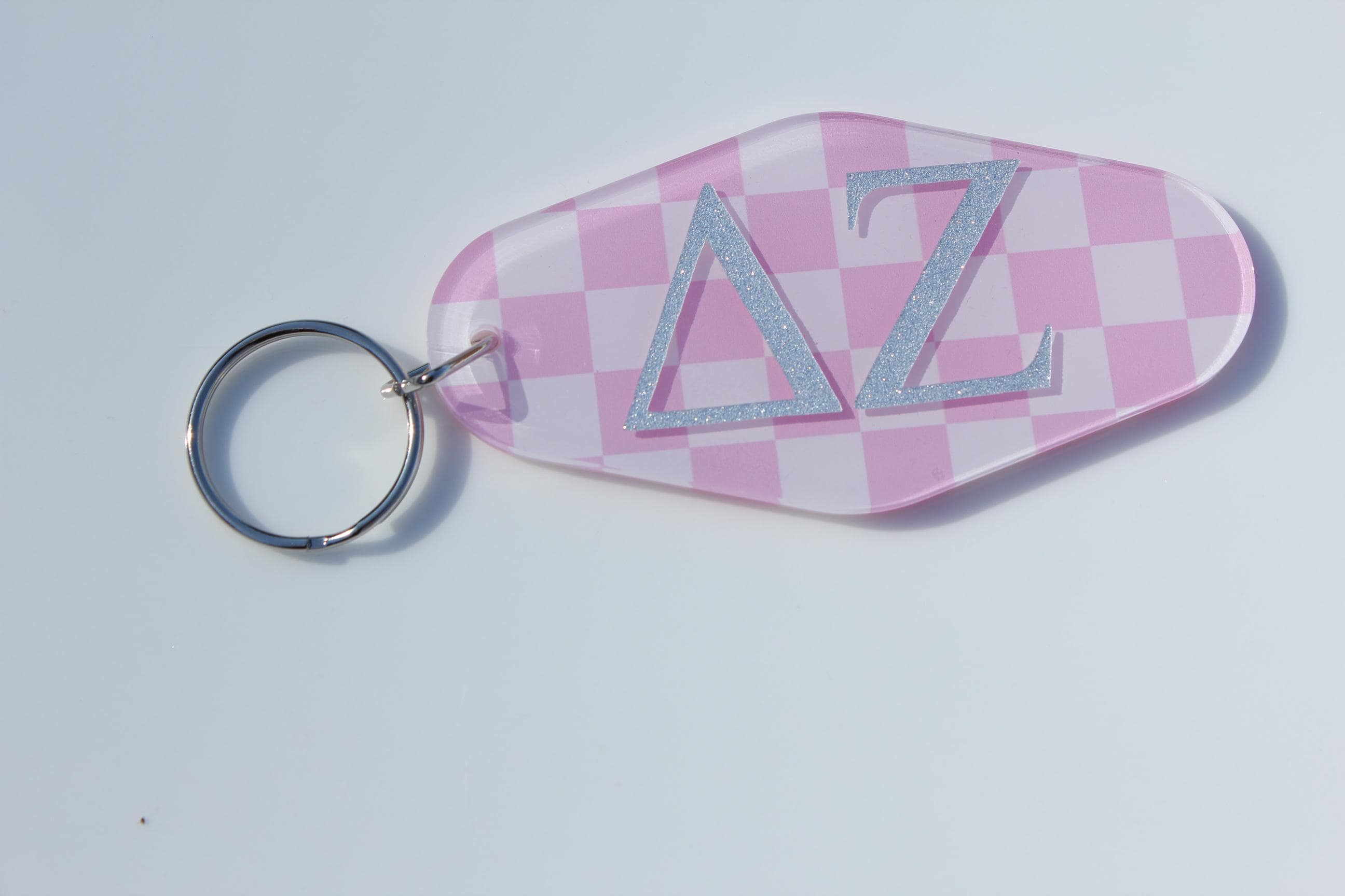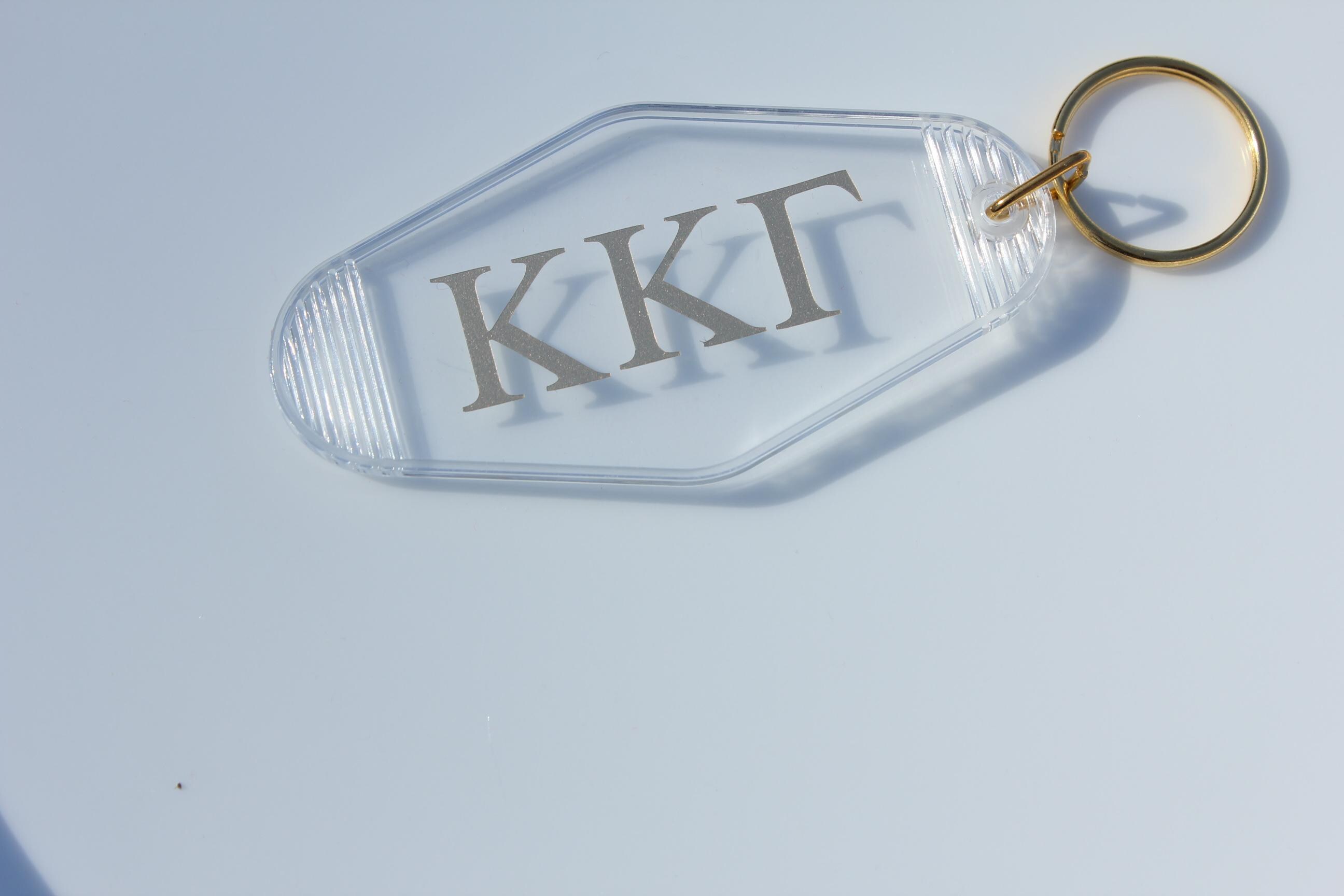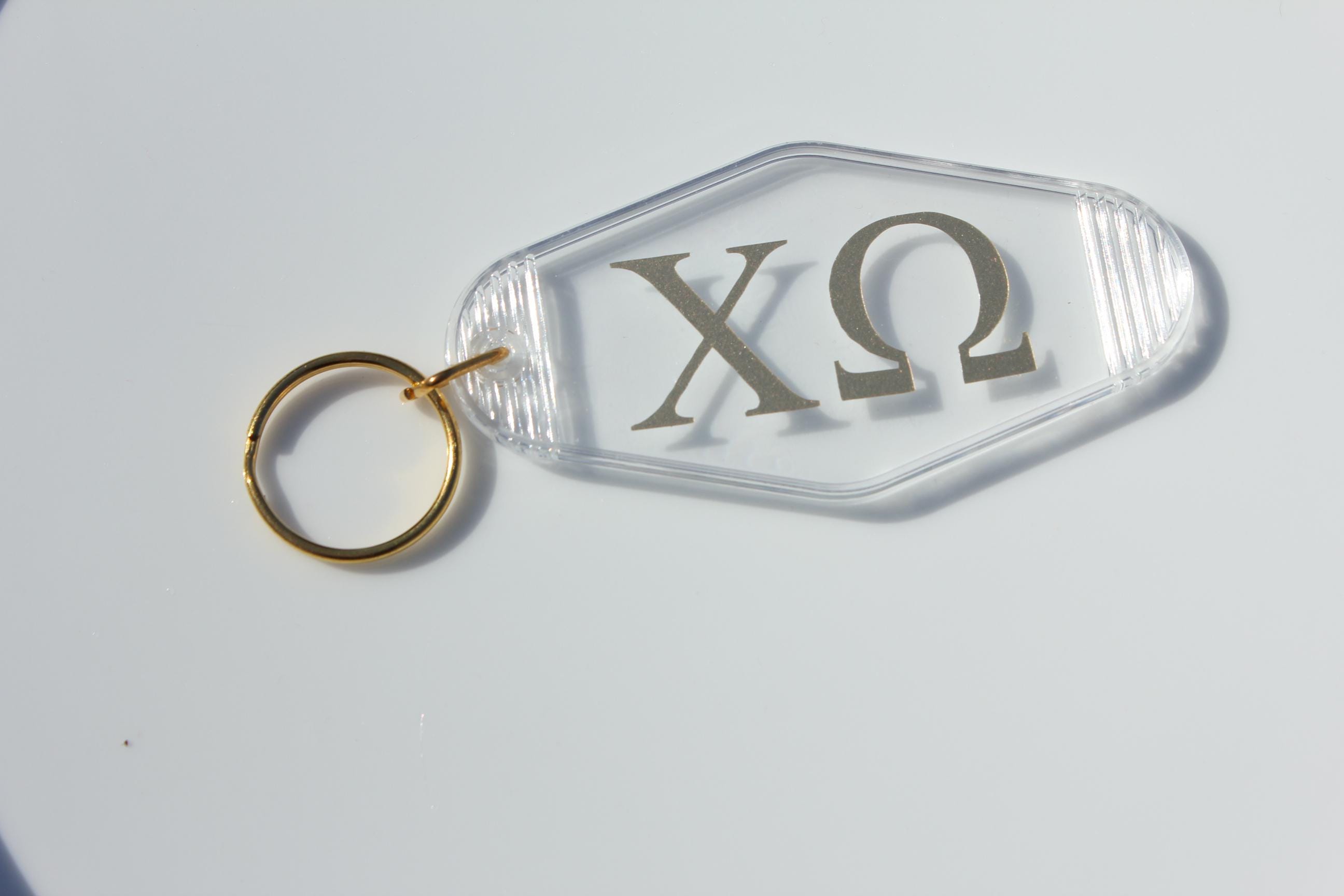 Trendy Acrylic Motel-style Keychain customized for Sorority Members and Alumni. Gold or Silver accents with gold or silver Greek Lettering and lightweight. Perfect for gifting your sisters, daughters, and new pledges on Bid Day. Show off your Chapter pride with these super cute, sturdy and affordable keychains.
