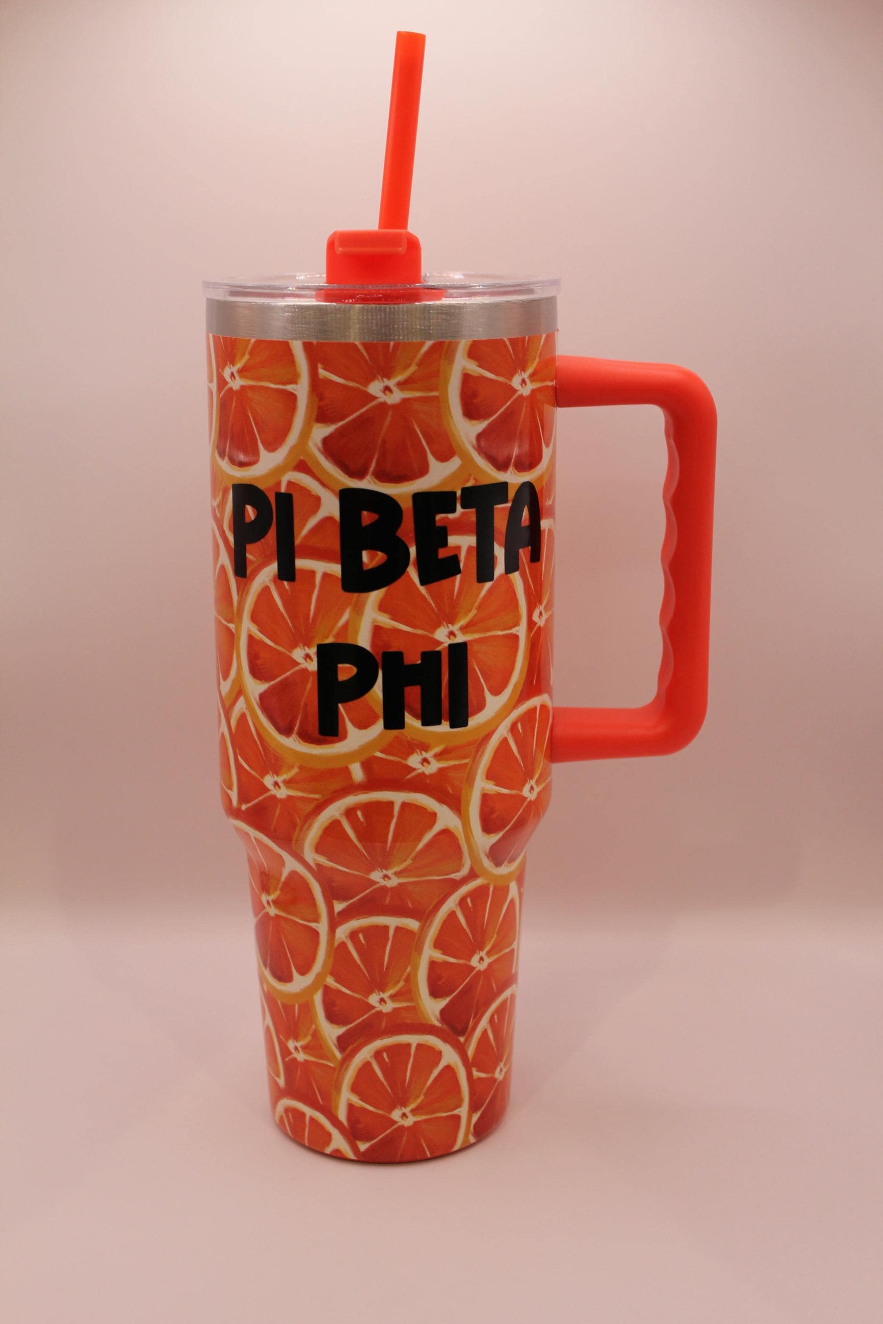 LIMITED EDITION Pi Beta Phi 30 oz. Orange Tumbler uniquely customized only for Pi Beta Phi Sorority members. Whether or not you love oranges, this adorable tumbler is a one of a kind! This is a limited edition tumbler with only 4 total made. It's not just a tumbler - it's a statement piece! Grab yours before they're GONE!